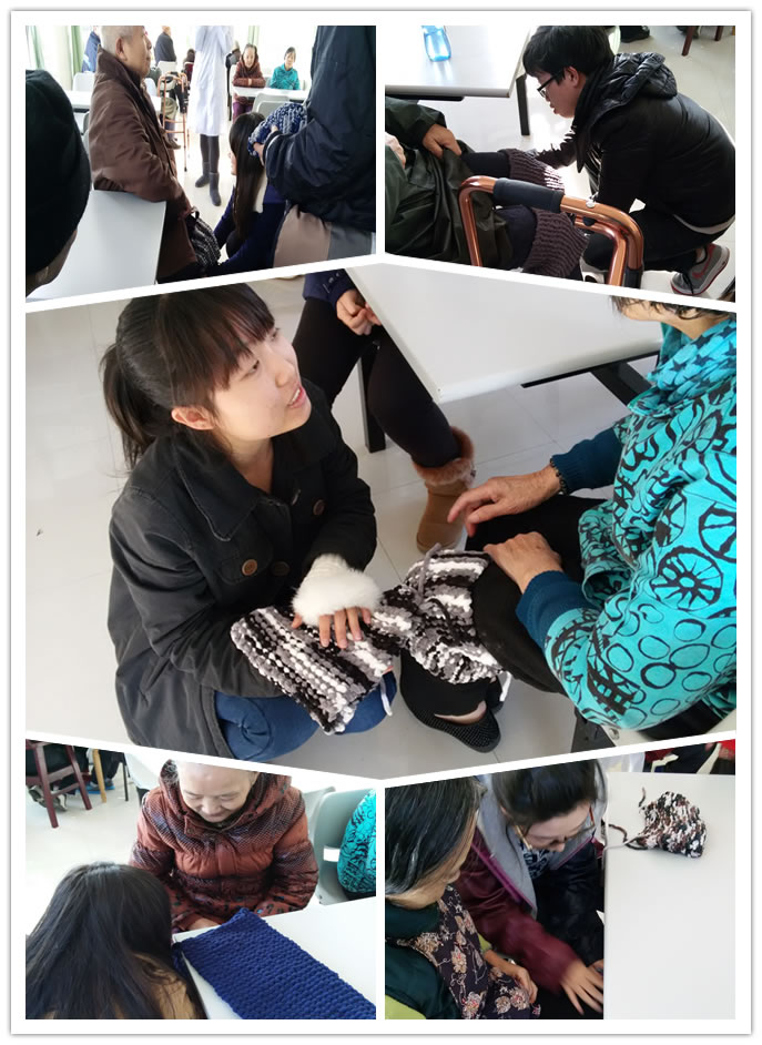 党员及积极分子,利用课余时间学习编织,亲手为老人们编织护膝及护腕,给爷爷奶奶们送去温暖。活动现场,学生们蹲下身子,亲手为老人们系上护膝,这小小的举动让有些老人当场感动落泪。尽管大家在语言上存在沟通障碍,但老人们始终紧紧地握着同学们的手。党支部的同学还特意为老人们准备了才艺表演和一些日常保健护理的小贴士。