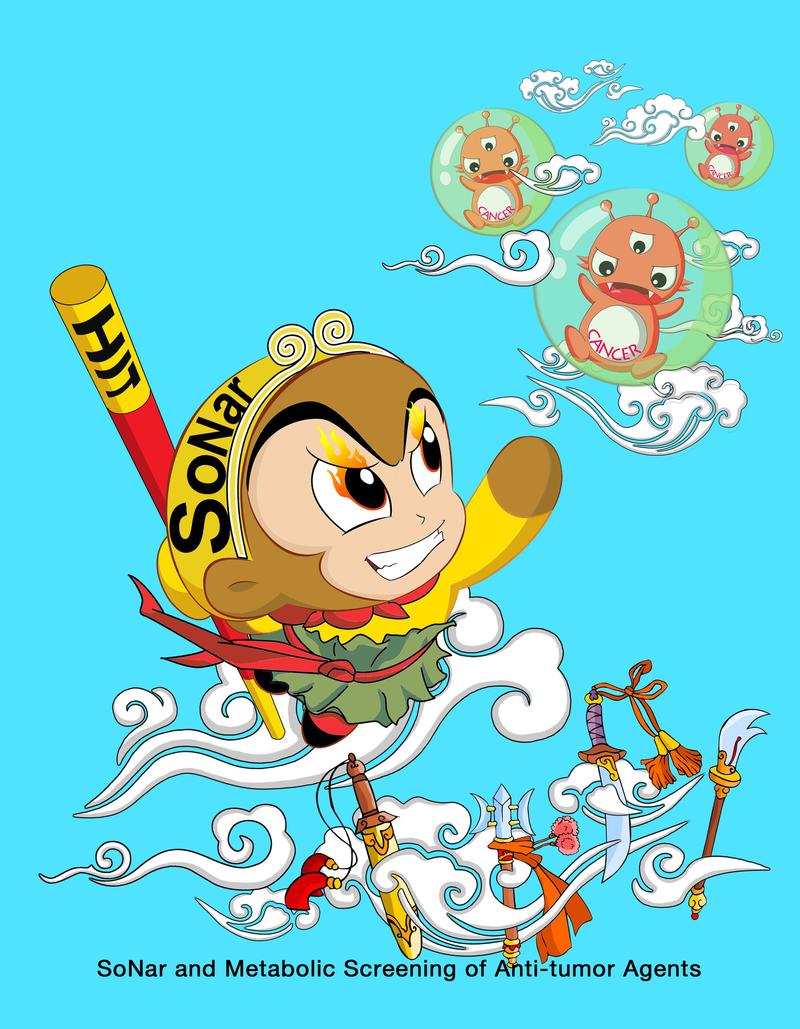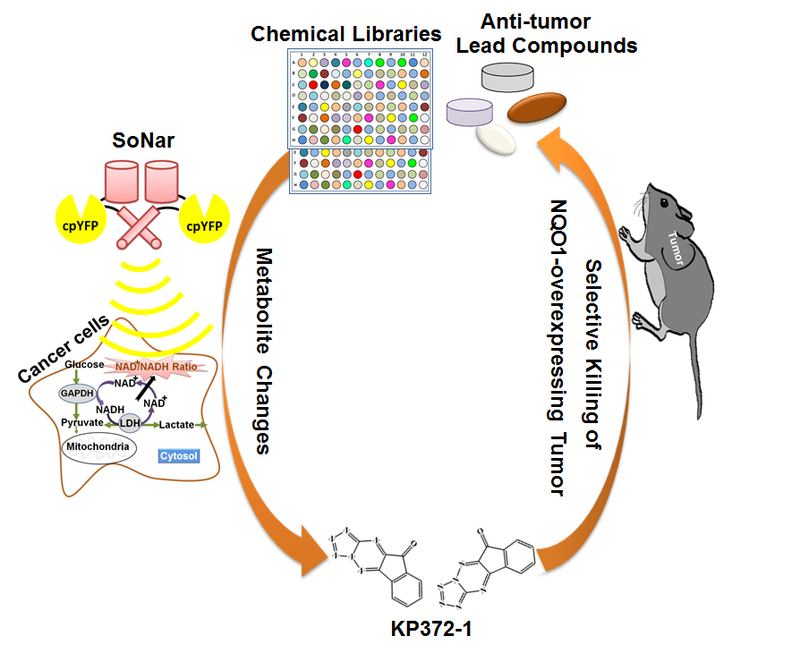 癌细胞代谢是癌症研究的前沿热点领域。近年来,人们发现癌细胞代谢的改变是肿瘤发生与生长的根本原因。通过控制癌细胞的异常代谢来杀伤、抑制癌细胞,或使之回到正常细胞,可有效抑制癌症发生的进程。然而,利用传统生化分析方法来研究细胞代谢活动并搜寻抗癌药物,存在着效率低、成本高的技术瓶颈。那么,有什么办法可以象孙悟空的火眼金睛一样,直接看到细胞的代谢过程,并鉴别出癌细胞呢?NAD/NADH是表征细胞代谢失衡的最佳参数,癌细胞有着与众不同的NADH水平。 2011年,杨弋团队报道了针对核心代谢物NADH的系列遗传编码荧光探针Frex,实现了在活细胞及各种亚细胞结构中对NADH分子的实时动态、特异性的检测与成像(Cell Metabolism 2011, 14, 555-566;Methods in Enzymology 2014, 542, 349-367;Current Opinion in Biotechnology 2015, 31, 86-92)。现在,该团队又报道了可同时检测NAD,NADH及其比率的第二代的细胞代谢荧光探针SoNar。SoNar基于合成生物学方法构建,具有高灵敏度、高亮度和巨大动态范围,就像火眼金睛一样,可察觉到癌细胞与正常细胞的微细代谢差异,真正实现在单细胞和活体动物水平对细胞代谢状态的高时空分辨检测和成像。利用SoNar,该团队进行了基于细胞代谢的首次活细胞水平高通量化合物筛选,鉴定了几百个调节细胞代谢活性的化合物,其中化合物KP372-1可在低浓度下广泛杀伤不同人体组织来源的癌细胞。利用代谢组学、化学和遗传学筛选等技术,最终鉴定了KP372-1是一种结构新颖的氧化还原循环底物,在癌细胞中特异高表达的NQO1酶催化下产生极度氧化应激,进而杀灭癌细胞。该化合物比目前已进入临床II期NQO1依赖的经典抗癌化合物β-拉帕醌(β-lapachone)具有更高的口服利用度、更长的药物作用半衰期和更低的药效浓度。这项研究建立的具有自有知识产权的药物筛选技术将为药物发现提供新的技术平台和依据,对于我国药物研发的自主创新和广大人民生命健康具有重大意义。此外,SoNar探针还可以广泛应用于细胞代谢相关的活细胞与活体实时监测,为人们更好地了解物质与能量代谢的调节机制提供重要的创新工具与手段。