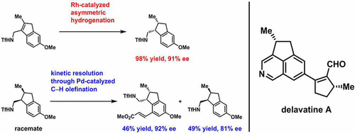 从合成策略的角度,合作团队没有沿用常规的对异喹啉起始物逐步取代的策略,而是运用了从头构建吡啶环的策略。从合成方法的角度,他们发展了两种不对称催化反应,即铑催化的茚类型四取代烯烃的不对称氢化反应,以及基于钯催化的三氟甲磺酰胺导向C–H烯基化的动力学拆分,以这两种不同的方式高立体选择性地构建了异喹啉片段的手性中心。不对称氢化反应倚靠上海有机化学研究所汤文军课题组发展的BIBOP类型双膦配体获得了较好的反应活性和立体选择性。C–H官能化中使用的导向基团在后续转化中直接作为官能基团参与了Mitsunobu反应和E1cb类消除反应,省去了导向基团的脱除步骤。该全合成的最长线性路线为13步,提供了克级规模的delavatine A样品,合成样品显示出显著的抗肿瘤活性。该工作为系统研究delavatine A的生物活性和作用机制提供了物质基础。