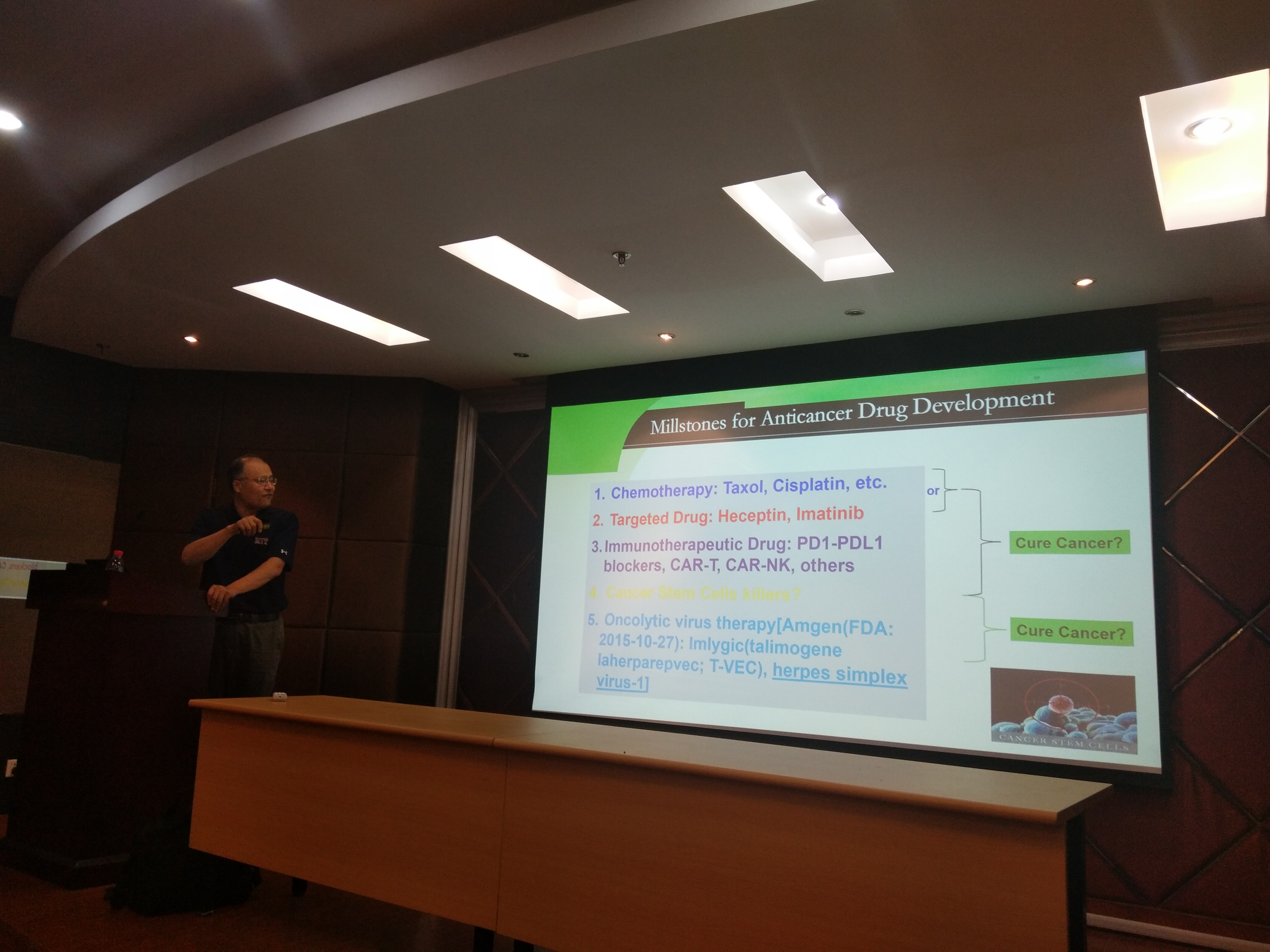 报告会上,刘刚教授生动的介绍了抗肿瘤临床候选药物康莫他赛的发现过程及抗肿瘤新药开发策略。转移和复发是癌症难以治愈的重要原因,针对已上市药物紫杉醇水溶性差的不足,其课题组将紫杉醇与具有抗肿瘤作用的MDP通过不同linker连接起来,并进行结构修饰,优化紫杉醇的理化性质,最终获得优良的临床候选药物康莫他赛。工作介绍详细具体,引人入胜,为与会者提供了全新的思路。