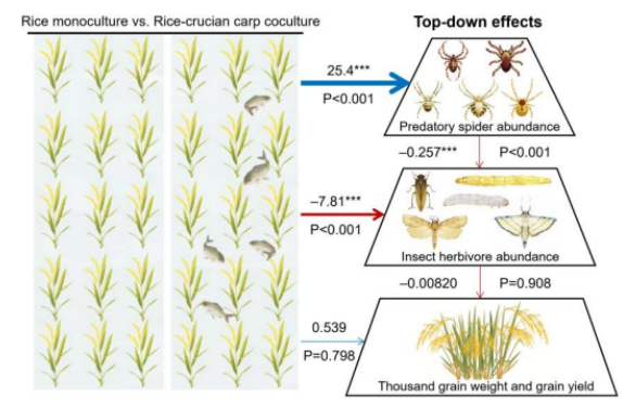 为进一步验证上述全球效应,万年峰课题组开展了连续4年的野外田间试验,研究证实:i)稻鱼共生区内的稻飞虱、螟虫、卷叶螟等主要害虫数量明显低于水稻单作区的,而捕食性蜘蛛数量则更高(图5);ii)养鱼后水稻千粒重和产量也增加(图6);iii)路径分析表明,稻鱼共生通过增加天敌数量来抑制害虫,进而实现间接增产效应(图7)。盆栽行为学实验进一步阐明机制:鲫鱼和红鲤鱼等鱼类偏好取食害虫(褐飞虱),而不捕食捕食性狼蛛(图8)。这意味着,鱼类在稻田中扮演着“精准调控者”的角色,既直接削减了害虫,又保护并强化了田间的天然“控害军团”,从而建立了一种高效的协同控害网络。