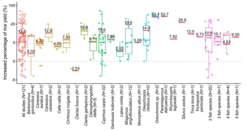 全球数据分析表明,与水稻单作相比,稻鱼共生使水稻产量平均提升12.5%,水稻增产因鱼的种类不同而不同(图2);与单一种植水稻相比,稻鱼共生可使产量提高12.5%,同时使无脊椎天敌(捕食者/寄生者)数量增加99.3%,并有效抑制害虫(减少24.1%)、病害(减少38.8%)和杂草(减少45.7%)(图2);就不同气候带、水稻类型和试验类型而言,温带控害与增产效果比热带的效果好,非有机稻田控害与增产效果比有机稻田的效果好,小区试验控害与增产效果比盆栽试验的效果好(图3);下行效应路径分析结果显示,在水稻-病虫草害二营养级互作系统中,稻鱼共生通过抑制有害生物来增产,在水稻-害虫-天敌三营养级互作系统中,稻鱼共生通过增加天敌数量来抑制害虫,进而实现间接增产效应(图4),将全球数据分成不同气候带、水稻类型和试验类型后,这种下行控制作用在有机与非有机系统、温带与热带地区均持续存在,即,稻鱼共生→促进天敌种群→抑制害虫→促进水稻生产力。